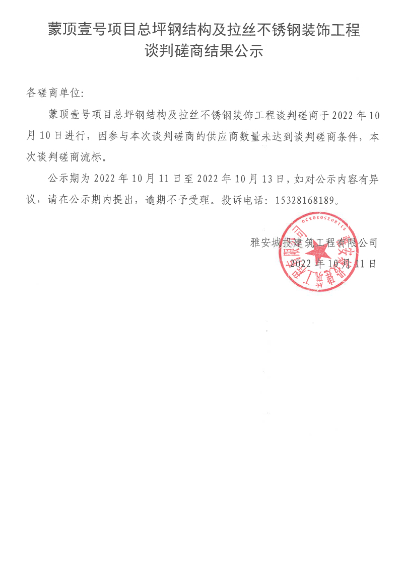 蒙頂壹號項目總坪鋼結(jié)構(gòu)及拉絲不銹鋼裝飾工程談判磋商結(jié)果公示