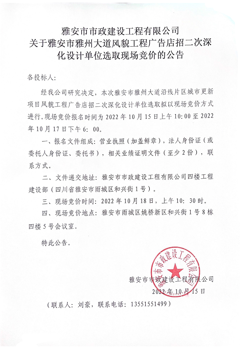 關(guān)于雅安市雅州大道風(fēng)貌工程廣告店招二次深化設(shè)計(jì)單位選取現(xiàn)場(chǎng)競(jìng)價(jià)的公告