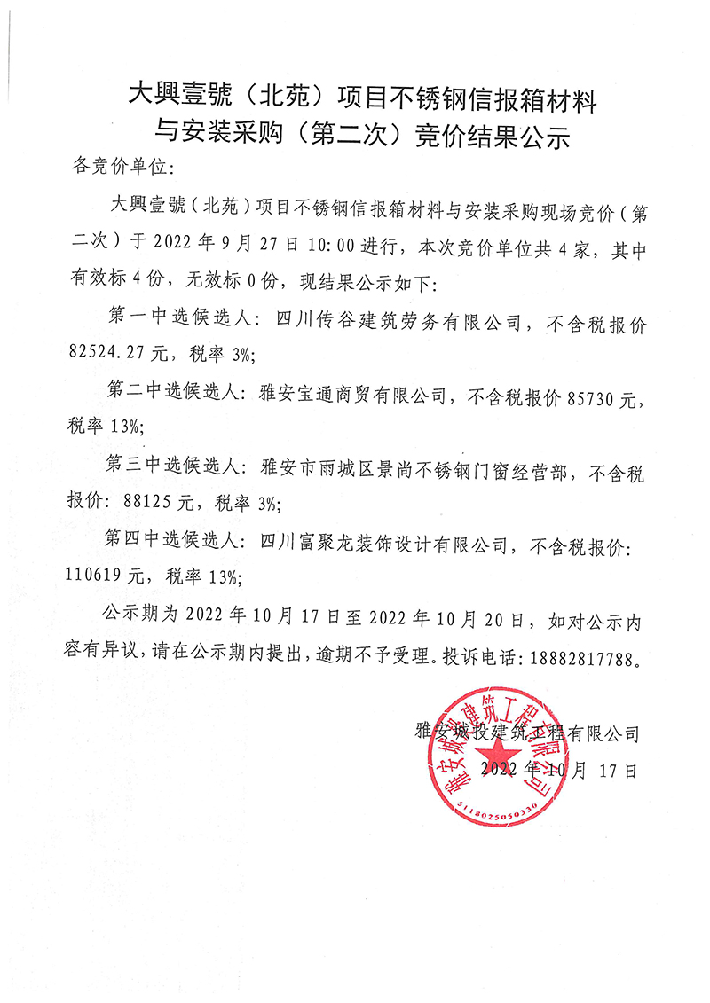 大興壹號(hào)(北苑)項(xiàng)目不銹鋼信報(bào)箱材料與安裝采購(第二次)競價(jià)結(jié)果公示