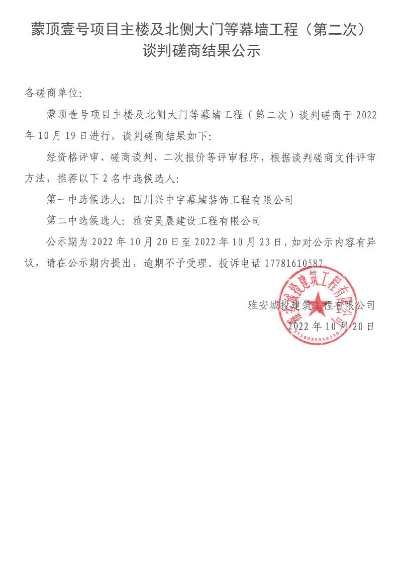 蒙頂壹號項(xiàng)目主樓及北側(cè)大門等幕墻工程(第二次)談判磋商結(jié)果公示