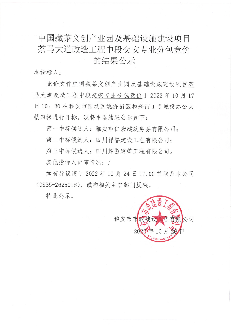 中國(guó)藏茶文創(chuàng)產(chǎn)業(yè)園及基礎(chǔ)設(shè)施建設(shè)項(xiàng)目茶馬大道改造工程中段交安專業(yè)分包競(jìng)價(jià)的結(jié)果公示