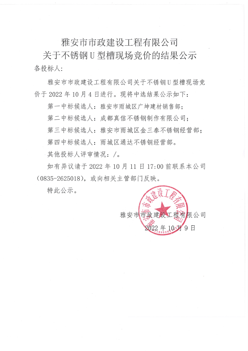 關(guān)于不銹鋼U型槽進行現(xiàn)場競價的結(jié)果公示