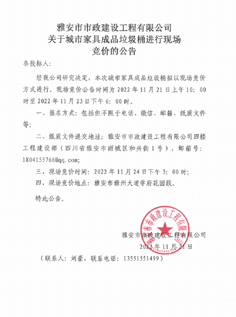 雅安市市政建設(shè)工程有限公司關(guān)于城市家具成品垃圾桶進(jìn)行現(xiàn)場競價的公告