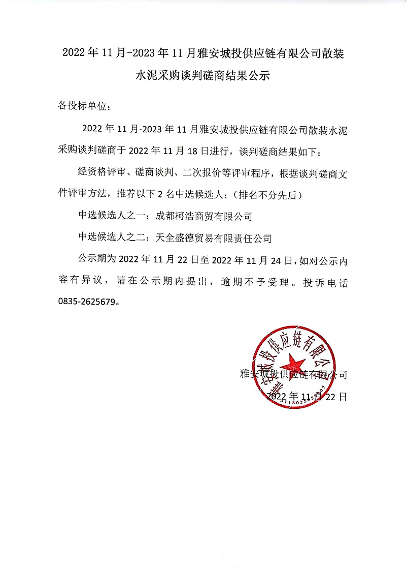 2022年11月-2023年11月雅安城投供應鏈有限公司散裝水泥采購談判磋商結果公示