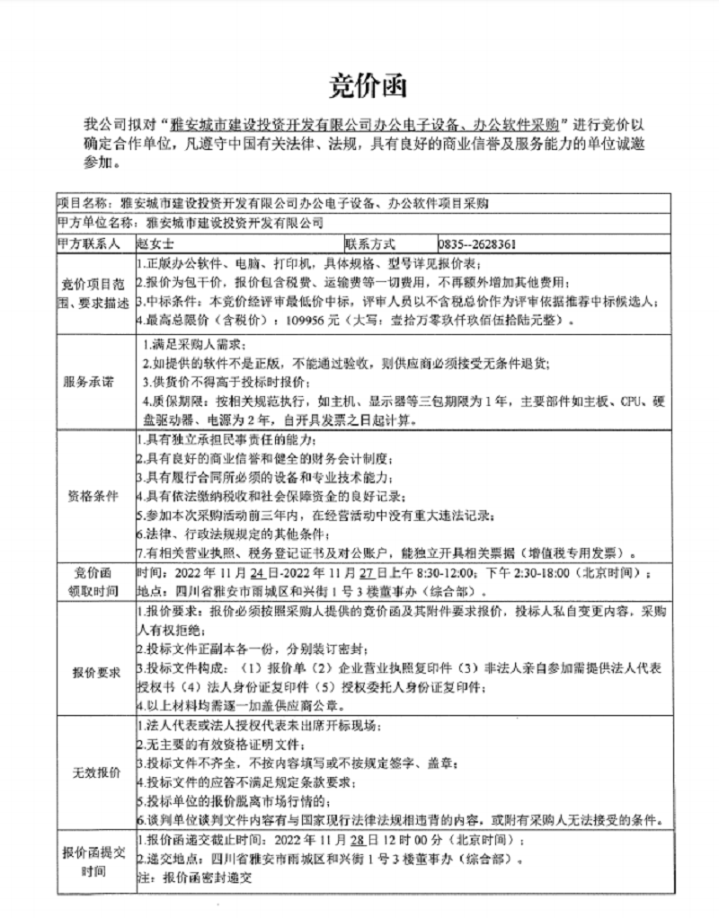 雅安城市建設投資開發(fā)有限公司辦公電子設備、辦公軟件項目采購競價公告