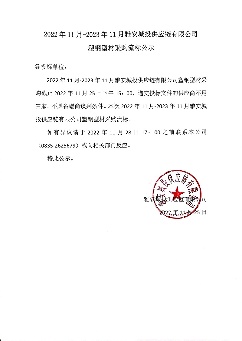 2022年11月-2023年11月雅安城投供應(yīng)鏈有限公司塑鋼型材采購流標公示