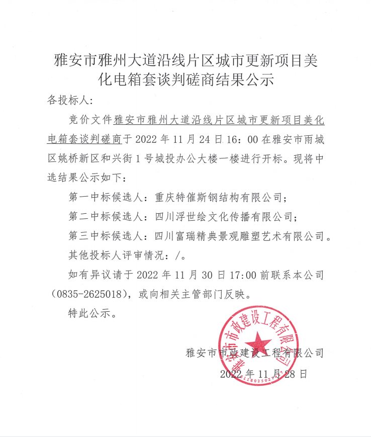 雅安市雅州大道沿線片區(qū)城市更新項(xiàng)目美化電箱套談判磋商結(jié)果公示