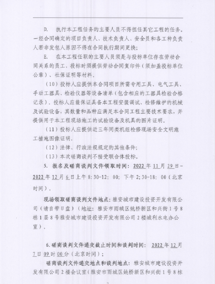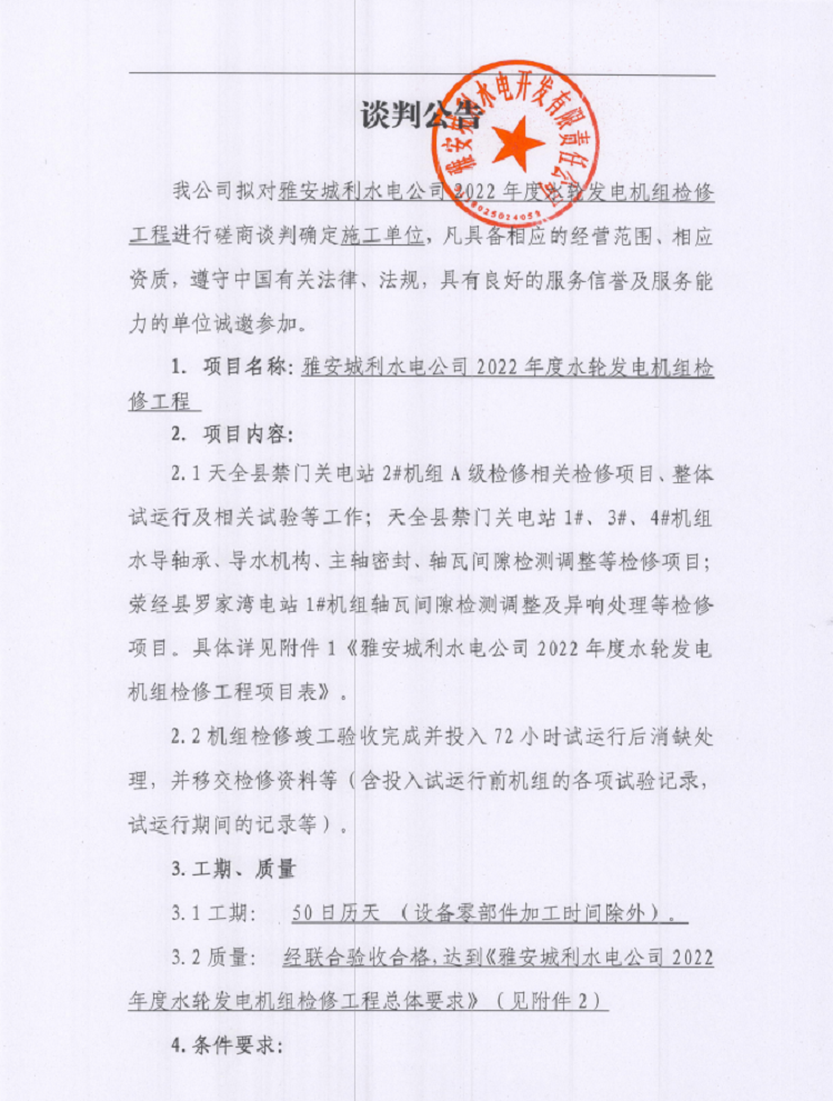 雅安城利水電公司2022年度水輪發(fā)電機(jī)組檢修工程談判磋商公告
