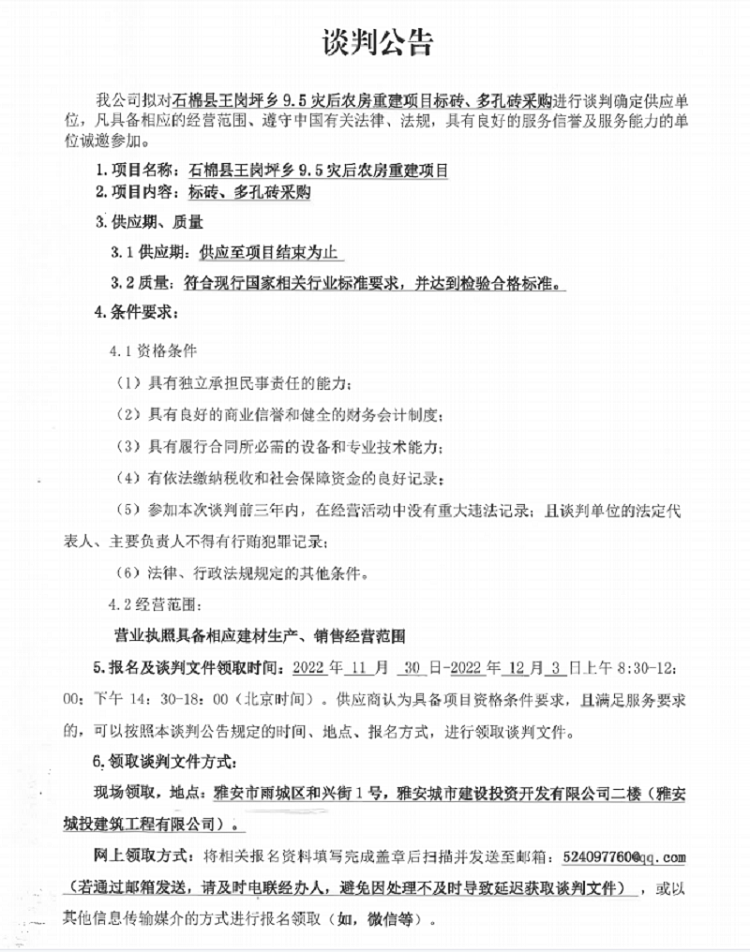 石棉縣王崗坪鄉(xiāng)9.5災后農房重建項目標磚、多孔磚采購談判公告