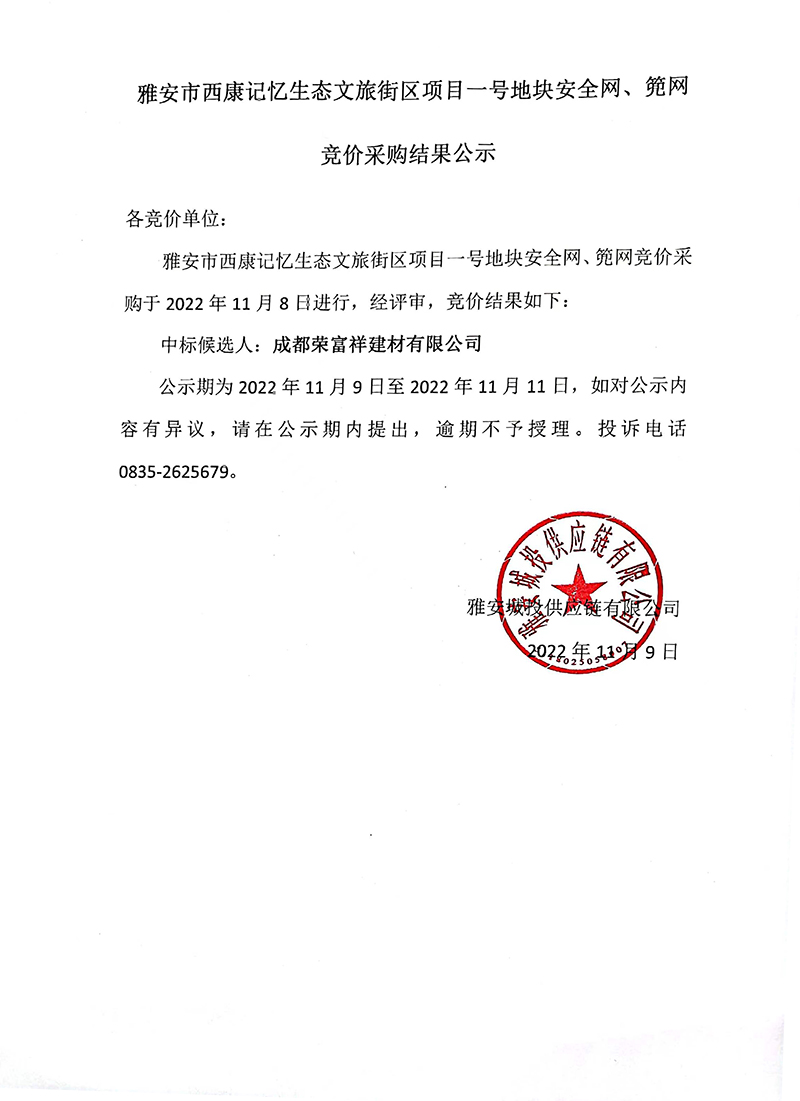 雅安市西康記憶生態(tài)文旅街區(qū)項(xiàng)目一號(hào)地塊安全網(wǎng)、篼網(wǎng)材料采購競價(jià)結(jié)果公示