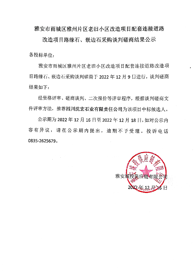 雅安市雨城區(qū)雅州片區(qū)老舊小區(qū)改造項目配套連接道路改造項目路緣石、嵌邊石采購談判磋商結果公示