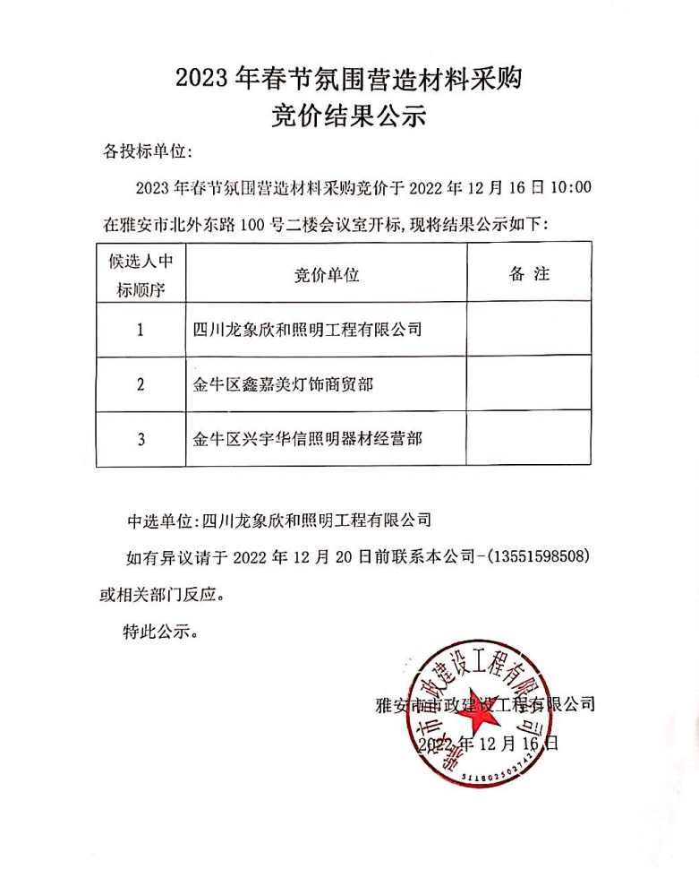 2023年春節(jié)氛圍營(yíng)造材料采購(gòu)競(jìng)價(jià)結(jié)果公示