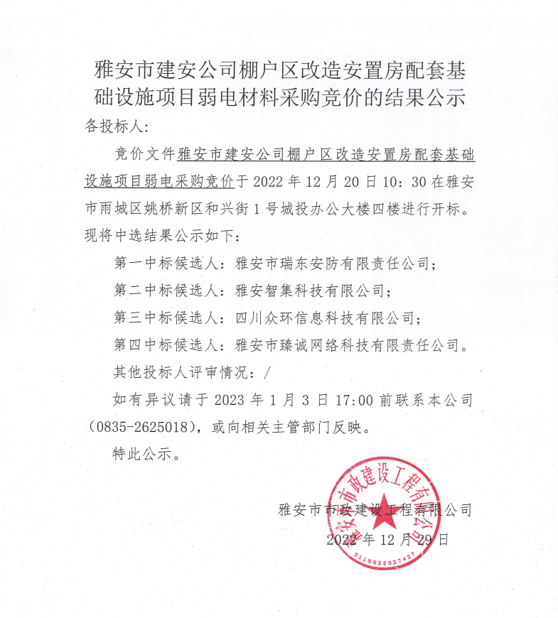 雅安市建安公司棚戶區(qū)改造安置房配套基礎設施項目弱電材料采購競價結果公示