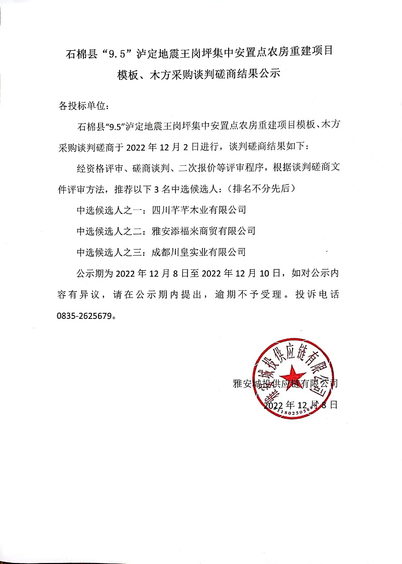 石棉縣“9.5”瀘定地震王崗坪集中安置點(diǎn)農(nóng)房重建項(xiàng)目模板、木方采購(gòu)談判磋商結(jié)果公示