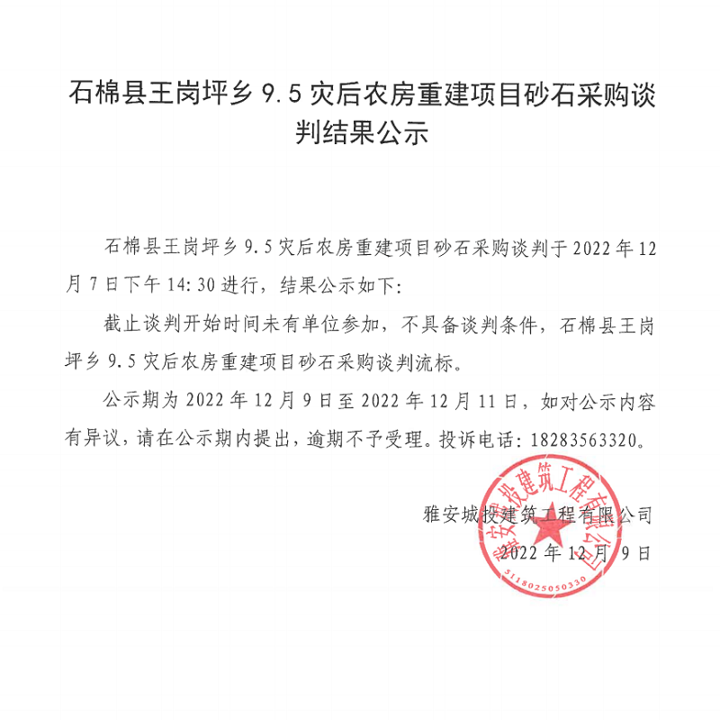石棉縣王崗坪鄉(xiāng)9.5災后農房重建項目砂石采購談判結果公示