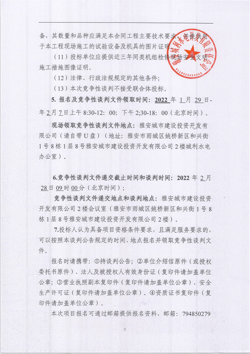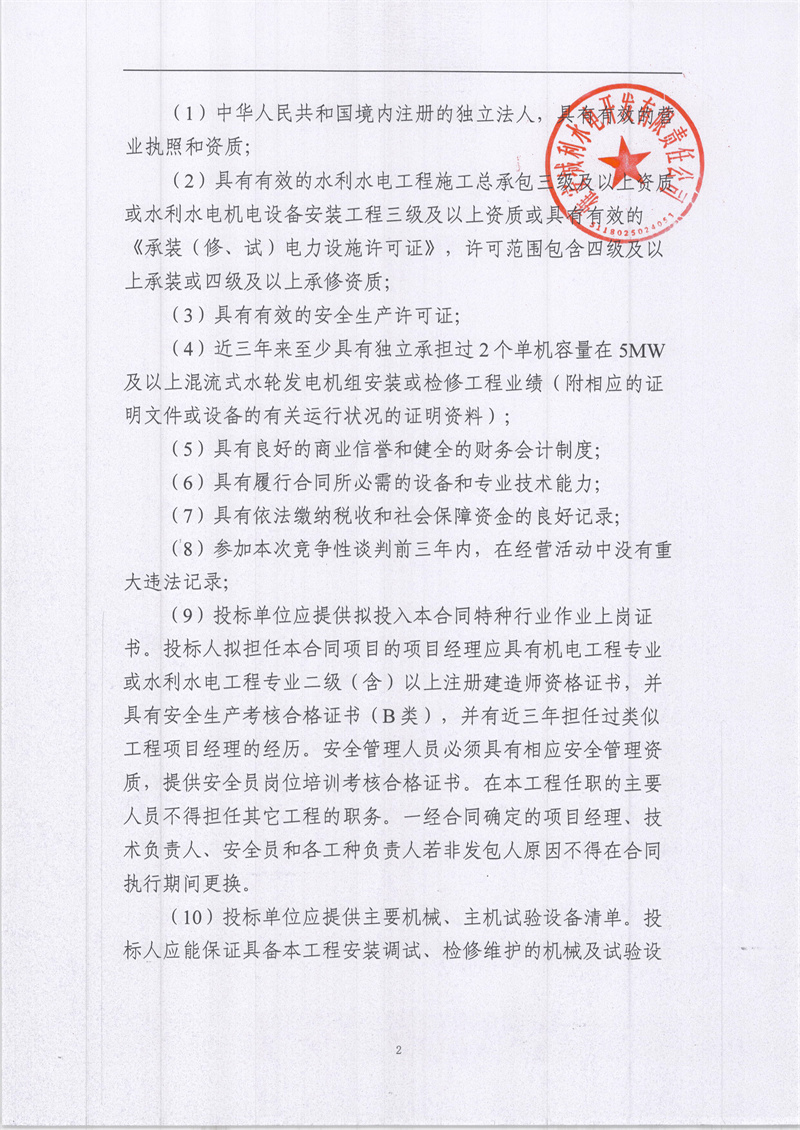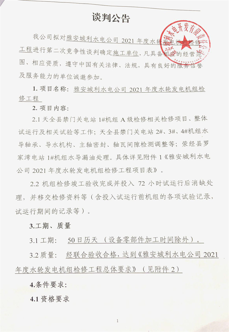 雅安城利水電公司2021年度水輪發(fā)電機組檢修工程競爭性談判公告(第二次)