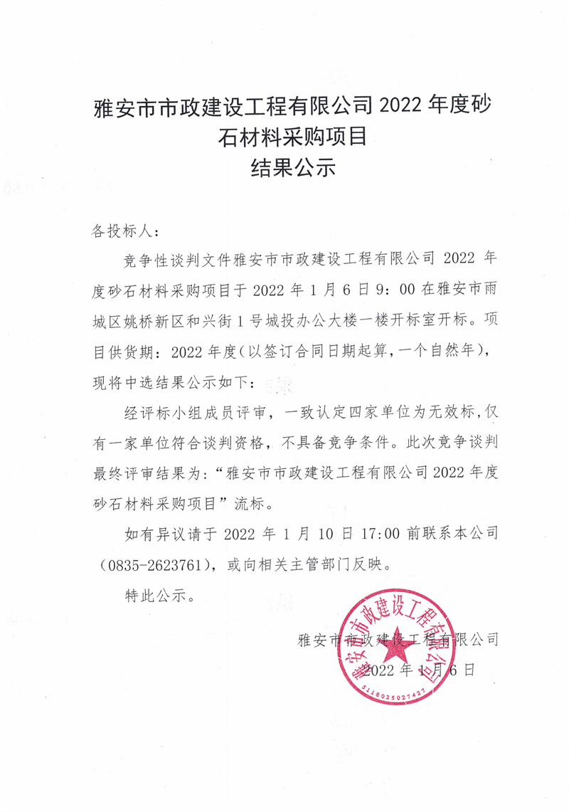 雅安市市政建設(shè)工程有限公司2022年度砂石材料采購(gòu)項(xiàng)目結(jié)果公示
