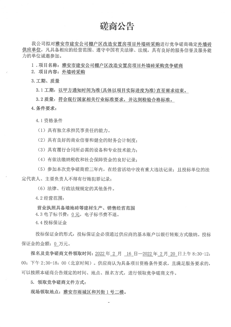 雅安市建安公司棚戶區(qū)改造安置房項(xiàng)目外墻磚采購(gòu)競(jìng)爭(zhēng)磋商公告
