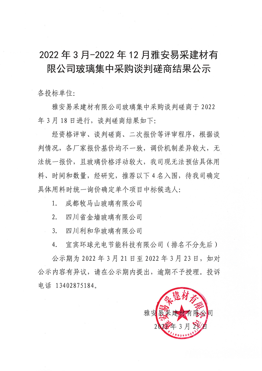 2022年3月-2022年12月雅安易采建材有限公司玻璃采購談判磋商結(jié)果公示