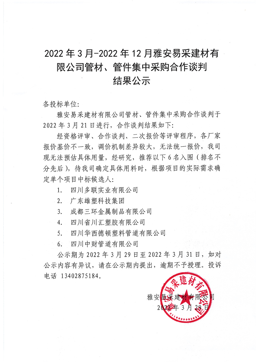 2022年3月-2022年12月雅安易采建材有限公司管材、管件集中采購(gòu)合作談判結(jié)果公示