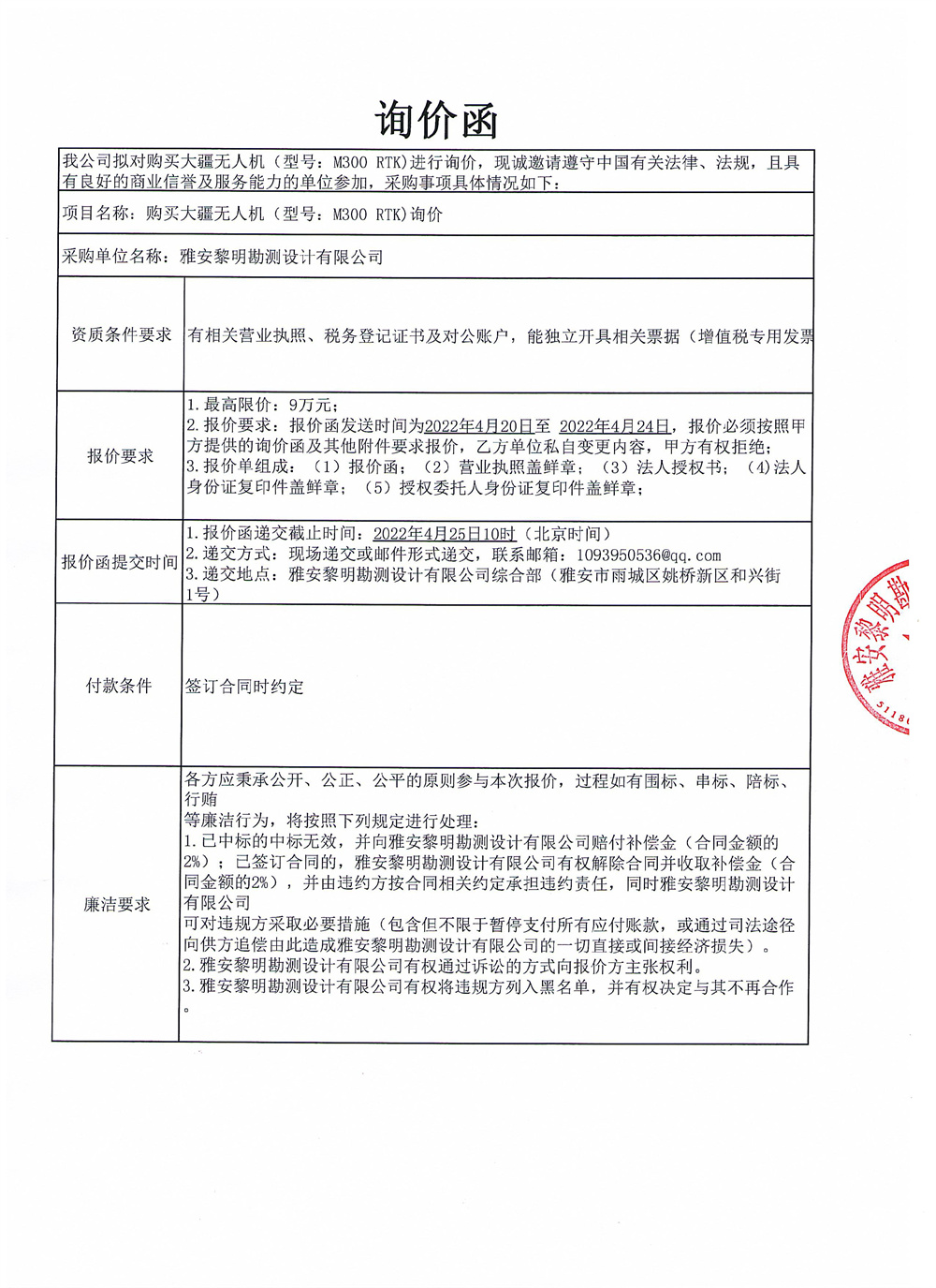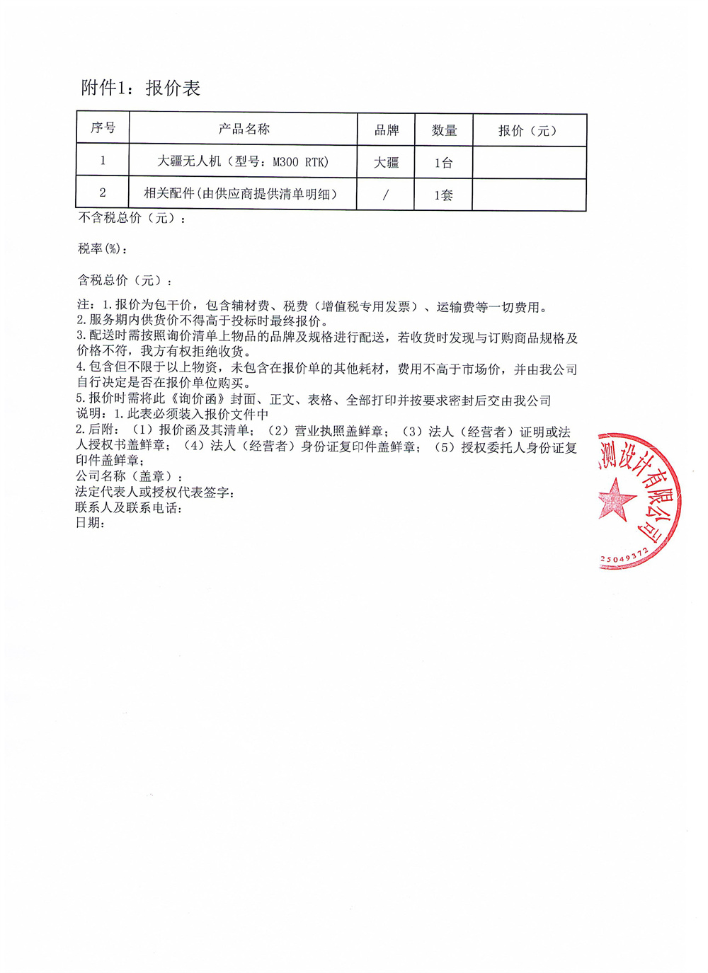 黎明勘測公司購買大疆無人機(型號:M300 RTK)詢價函