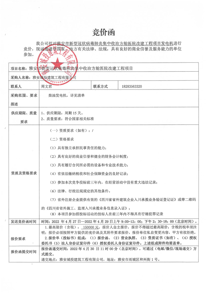 雅安市新型冠狀病毒肺炎集中收治方艙醫(yī)院改建工程項(xiàng)目發(fā)電機(jī)競價(jià)函