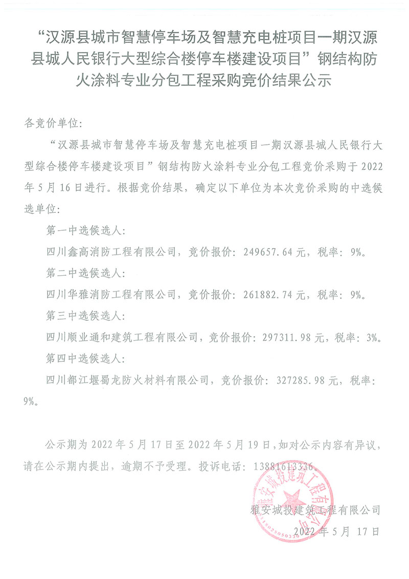 漢源縣城市智慧停車場及智慧充電樁項目一期漢源縣城人民銀行大型綜合樓停車樓建設項目防火涂料專業(yè)分包工程采購競價結果公示