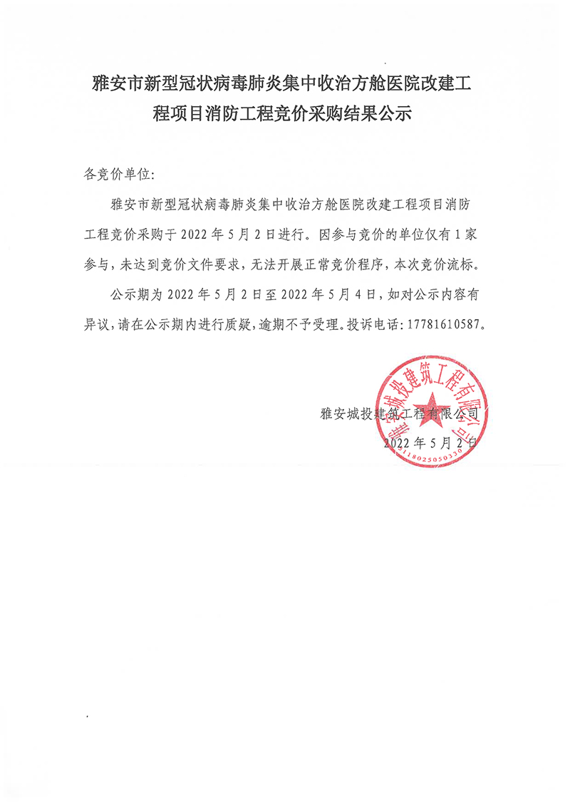 雅安市新型冠狀病毒肺炎集中收治方艙醫(yī)院改建工程項(xiàng)目消防工程競(jìng)價(jià)采購(gòu)結(jié)果公示