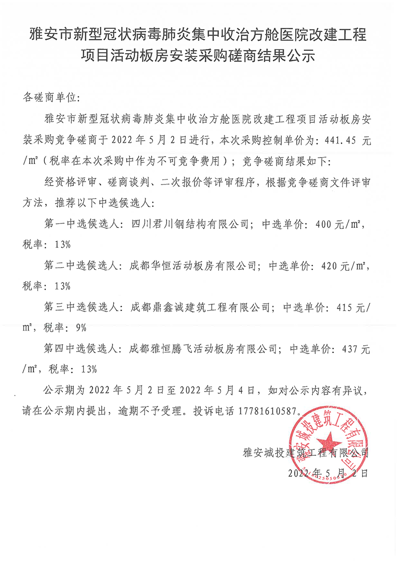 雅安市新型冠狀病毒肺炎集中收治方艙醫(yī)院改建工程項(xiàng)目活動(dòng)板房安裝采購磋商結(jié)果公示