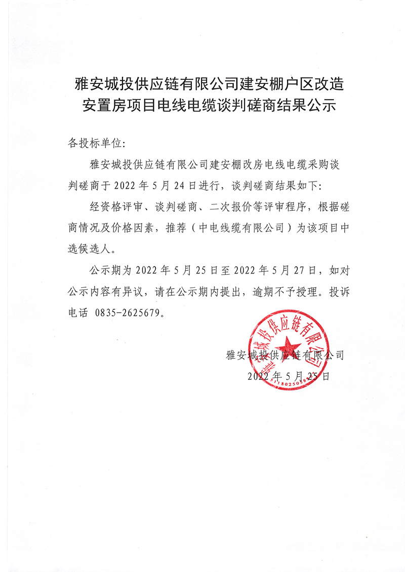 雅安城投供應鏈有限公司建安公司棚戶區(qū)改造安置房項目電線電纜談判磋商結果公示