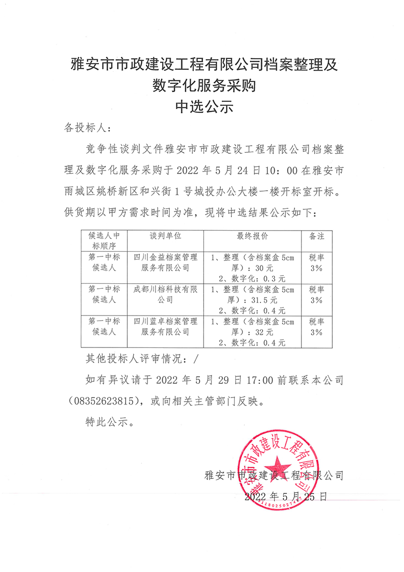 雅安市市政建設工程有限公司檔案整理及數(shù)字化服務采購中選公示