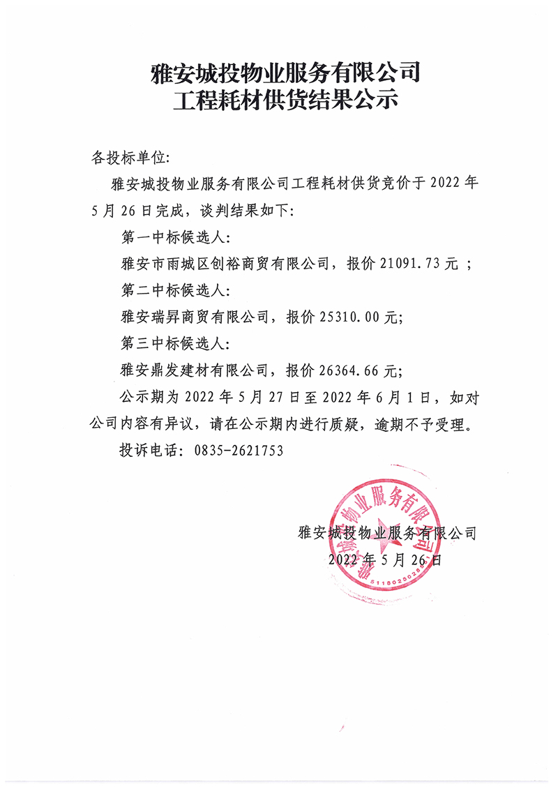 雅安城投物業(yè)服務有限公司工程耗材供貨結(jié)果公示
