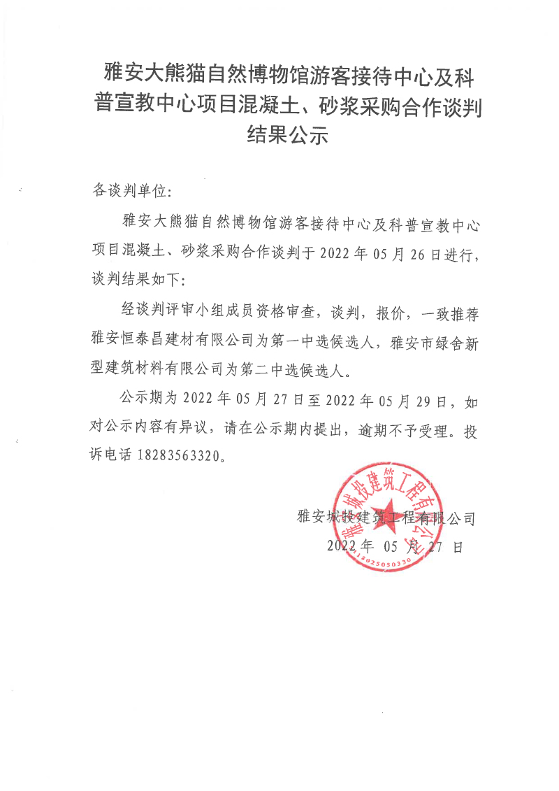 雅安大熊貓自然博物館游客接待中心及科普宣教中心項(xiàng)目混凝土、砂漿采購(gòu)合作談判結(jié)果公示