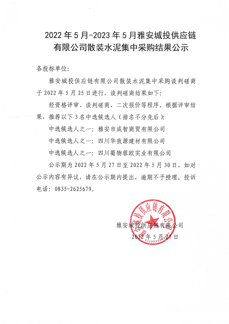 2022年5月-2023年5月雅安城投供應(yīng)鏈有限公司散裝水泥采購(gòu)結(jié)果公示