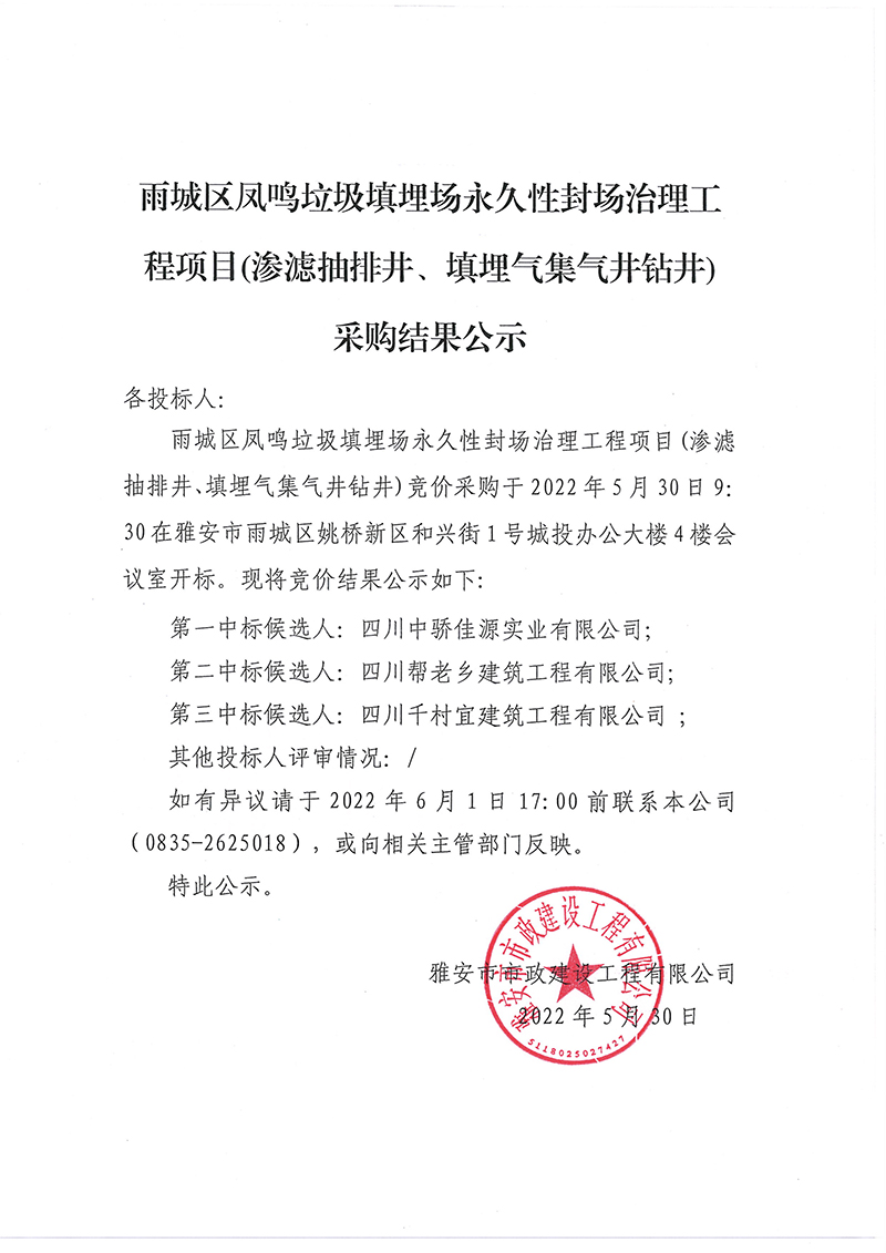 雨城區(qū)鳳鳴垃圾填埋場永久性封場治理工程項目(滲濾抽排井、填埋氣集氣井鉆井)采購結(jié)果公示
