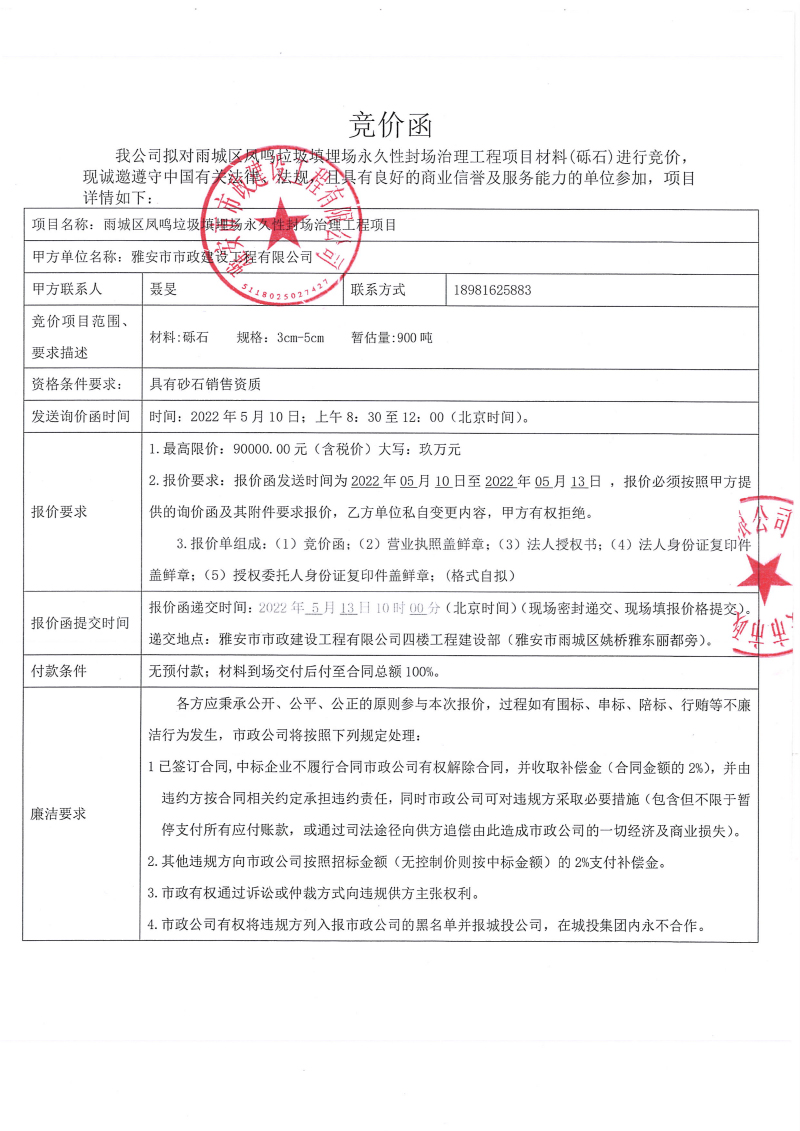 雨城區(qū)鳳鳴垃圾填埋場永久性封場治理工程項(xiàng)目材料(礫石)競價(jià)公告