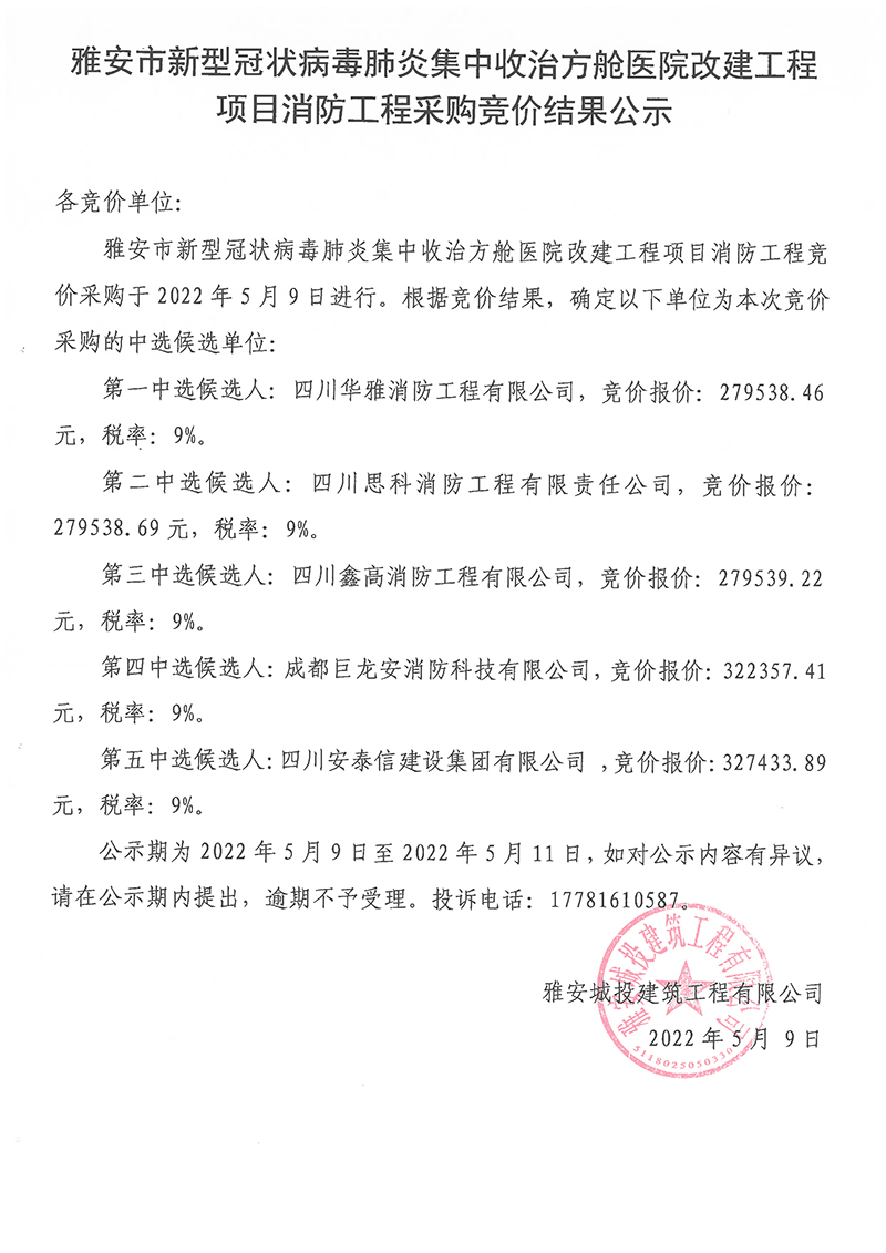 雅安市新型冠狀病毒肺炎集中收治方艙醫(yī)院改建工程項(xiàng)目消防工程采購競價(jià)結(jié)果公示