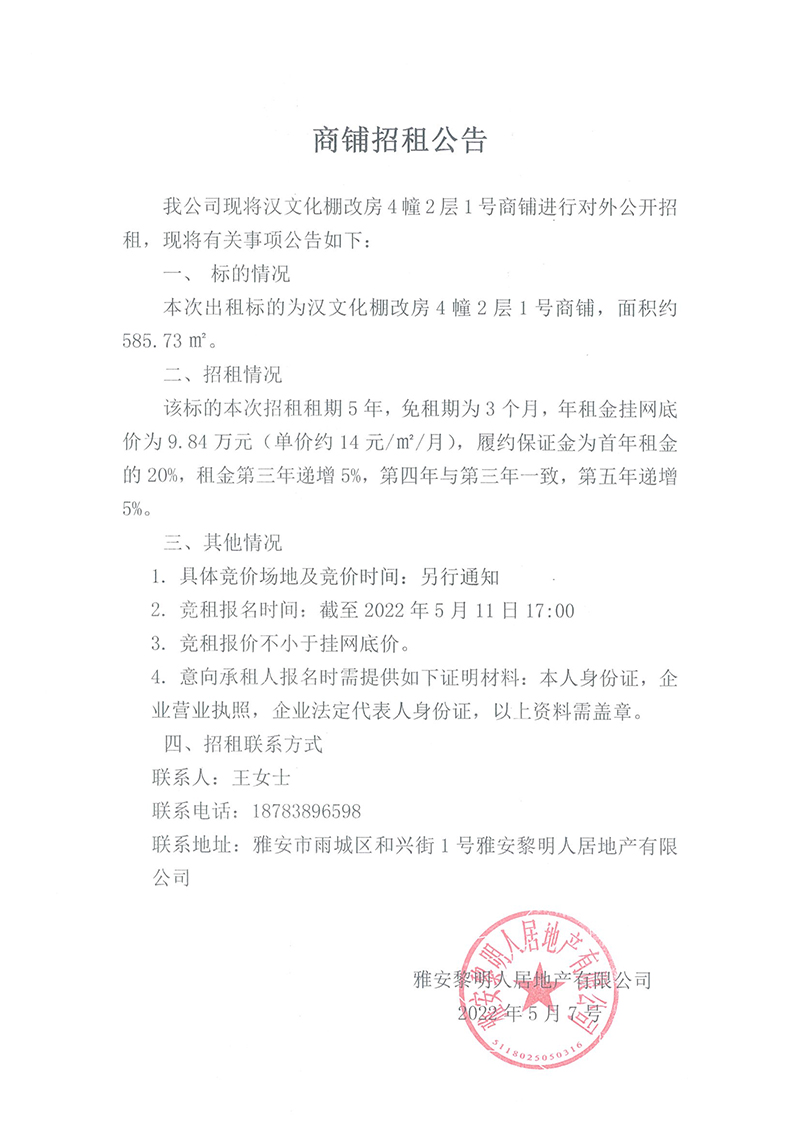 漢文化棚改房4幢2層1號(hào)商鋪招租公告