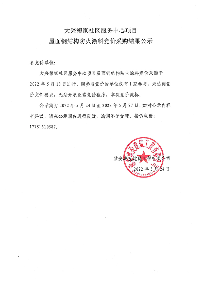 大興穆家社區(qū)服務(wù)中心項(xiàng)目屋頂鋼結(jié)構(gòu)防火涂料競價(jià)采購結(jié)果公示