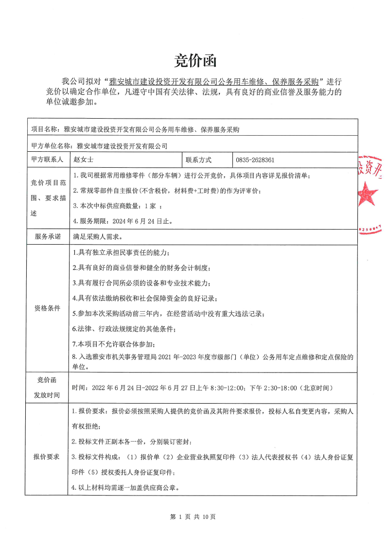 雅安城市建設(shè)投資開發(fā)有限公司 公務(wù)用車維修、保養(yǎng)服務(wù)采購項(xiàng)目競價(jià)公告