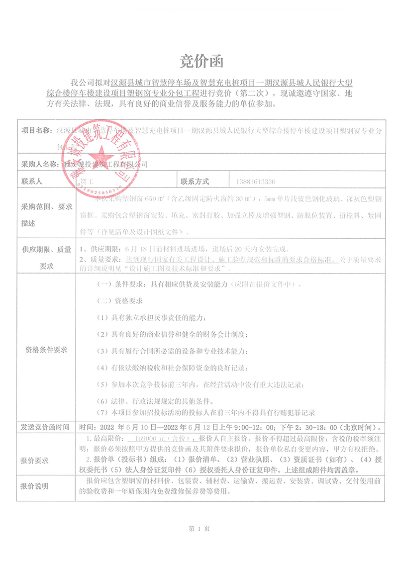 漢源縣城市智慧停車場(chǎng)及智慧充電樁項(xiàng)目一期漢源縣城人民銀行大型綜合樓停車樓建設(shè)項(xiàng)目塑鋼窗專業(yè)分包工程競(jìng)價(jià)采購競(jìng)價(jià)公告