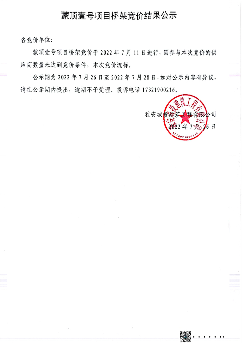蒙頂壹號項(xiàng)目橋架競價結(jié)果公示