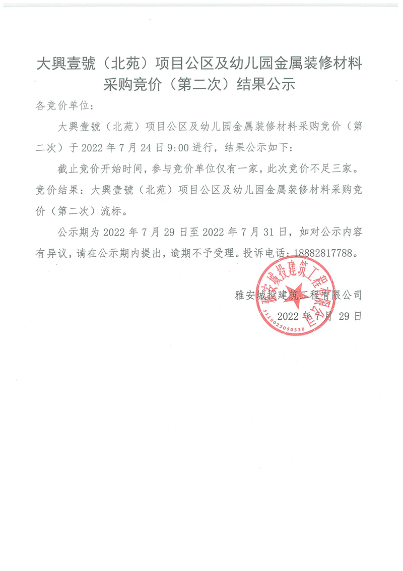 大興壹號(hào)(北苑)公區(qū)與幼兒園金屬裝修材料采購競價(jià)(第二次)結(jié)果公示