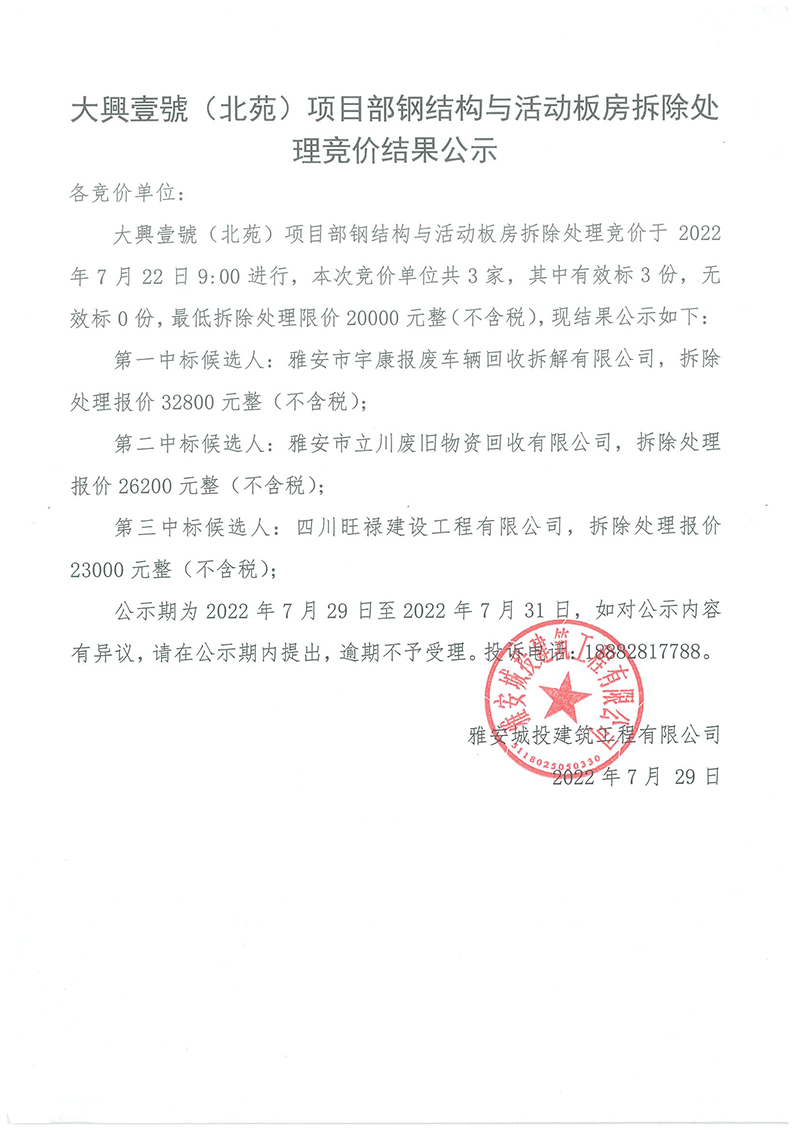 大興壹號(hào)(北苑)鋼結(jié)構(gòu)與活動(dòng)板房拆除處理競(jìng)價(jià)結(jié)果公示
