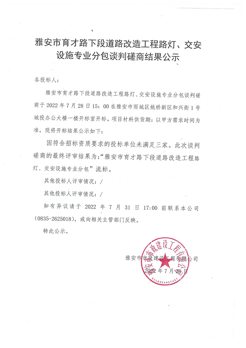 雅安市育才路下段道路改造工程路燈、交安設(shè)施專業(yè)分包談判磋商結(jié)果公示