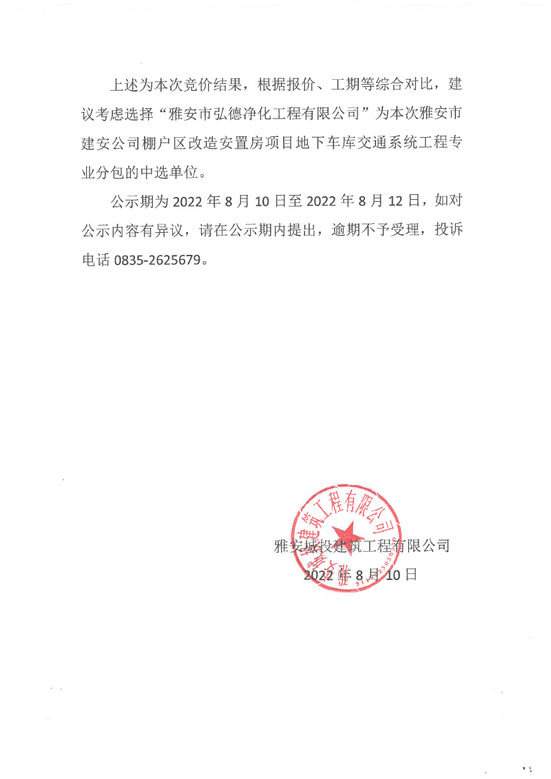 雅安市建安公司棚戶區(qū)改造安置房項(xiàng)目地下車(chē)庫(kù)交通系統(tǒng)工程專業(yè)分包競(jìng)價(jià)結(jié)果公示