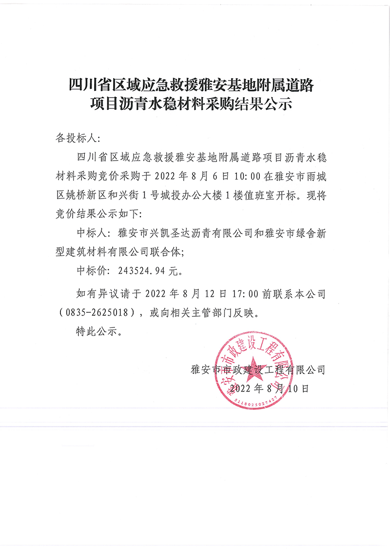 四川省區(qū)域應(yīng)急救援雅安基地附屬道路項(xiàng)目瀝青水穩(wěn)材料采購(gòu)結(jié)果公示