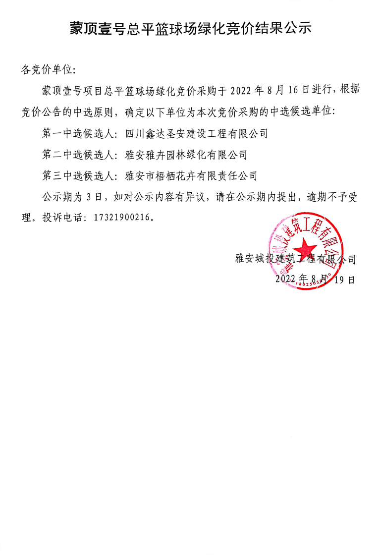 蒙頂壹號(hào)項(xiàng)目總平籃球場綠化競價(jià)結(jié)果公示