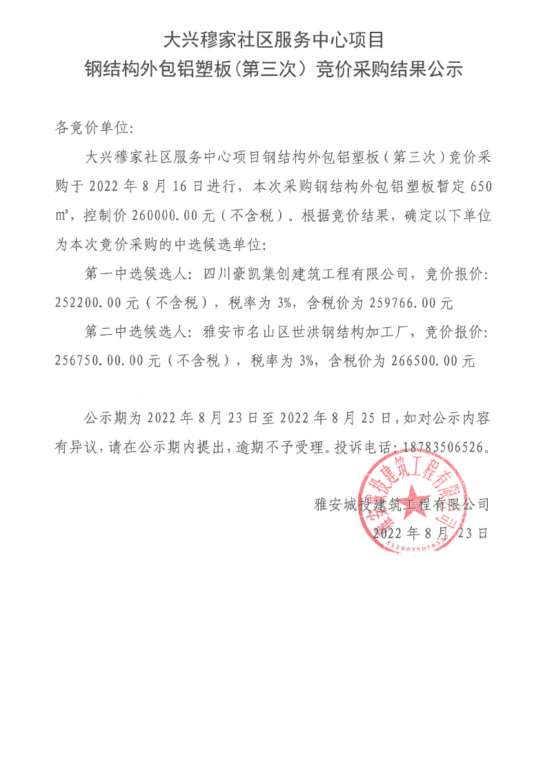 大興穆家社區(qū)服務(wù)中心項目鋼結(jié)構(gòu)外包鋁塑板(第三次)競價采購結(jié)果公示
