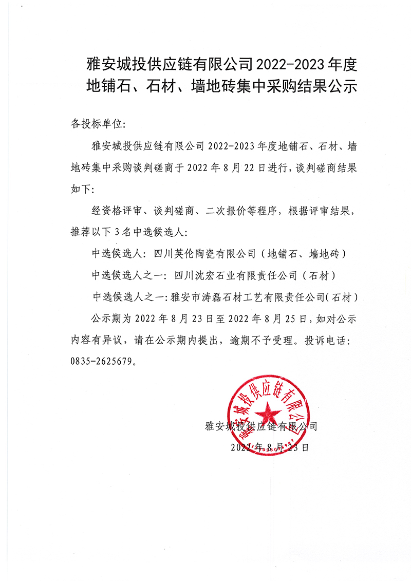 雅安城投供應(yīng)鏈有限公司2022-2023年度地鋪石、石材、墻地磚集中采購結(jié)果公示